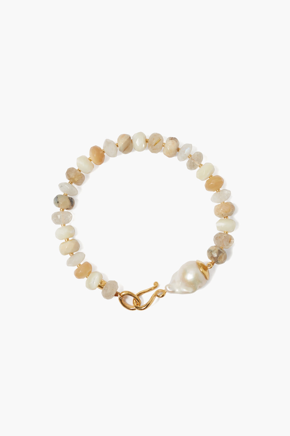 18K gold plated sterling silver bracelet featuring a capped baroque pearl, moonstone, rutilated quartz, brioche agate and mother of pearl. 7 1/2in. length.