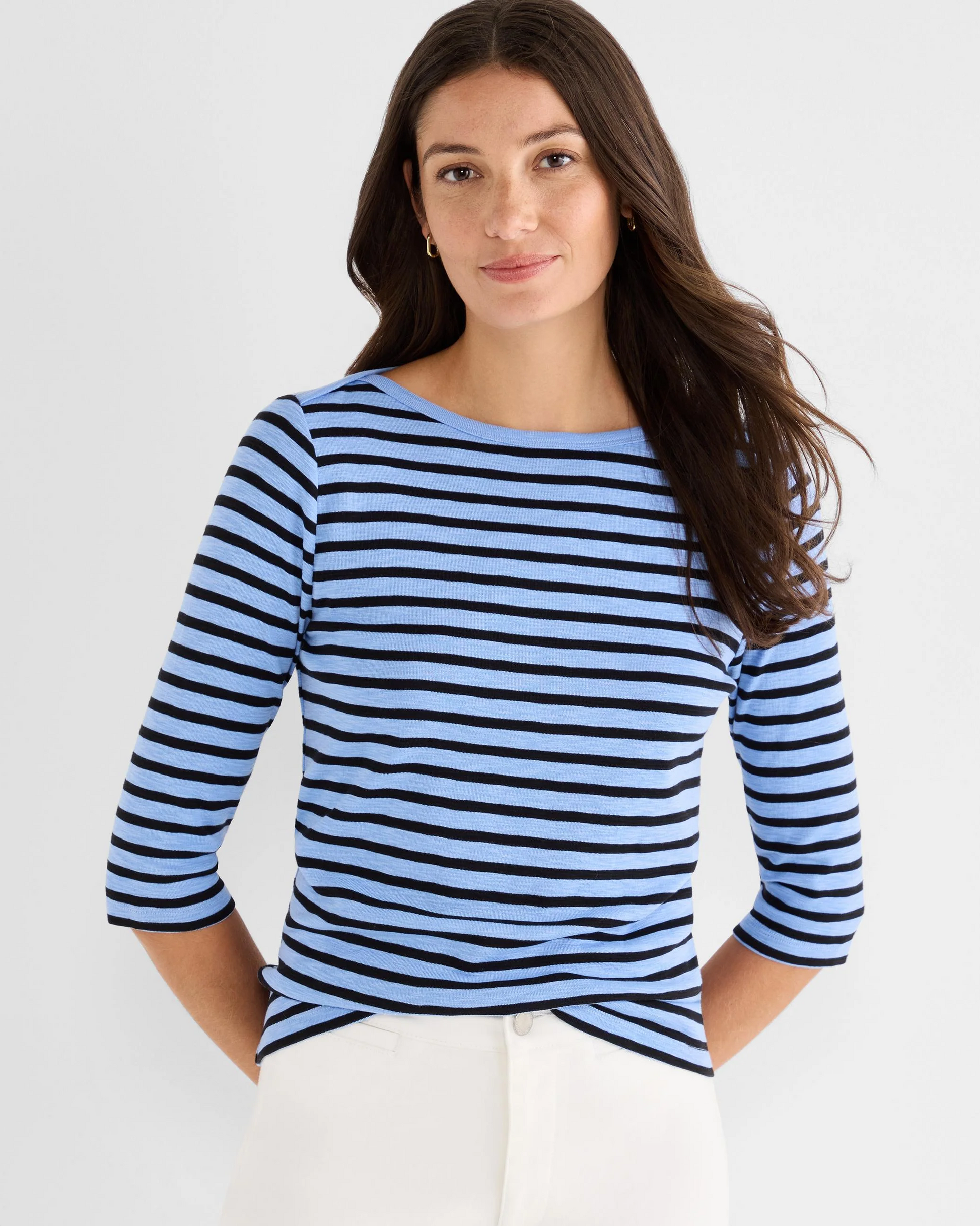 Classic striped boat tee reimagined with an elegant envelope neckline for a refined, polished look. The slightly wider neckline pairs beautifully with classic stripes and versatile 3/4 sleeves, making it perfect as a standalone piece or layered under jackets and sweaters. Midweight fabric in a regular fit sits at the hip with a comfortable 23" length. Effortlessly transitions from casual to dressed-up styling.