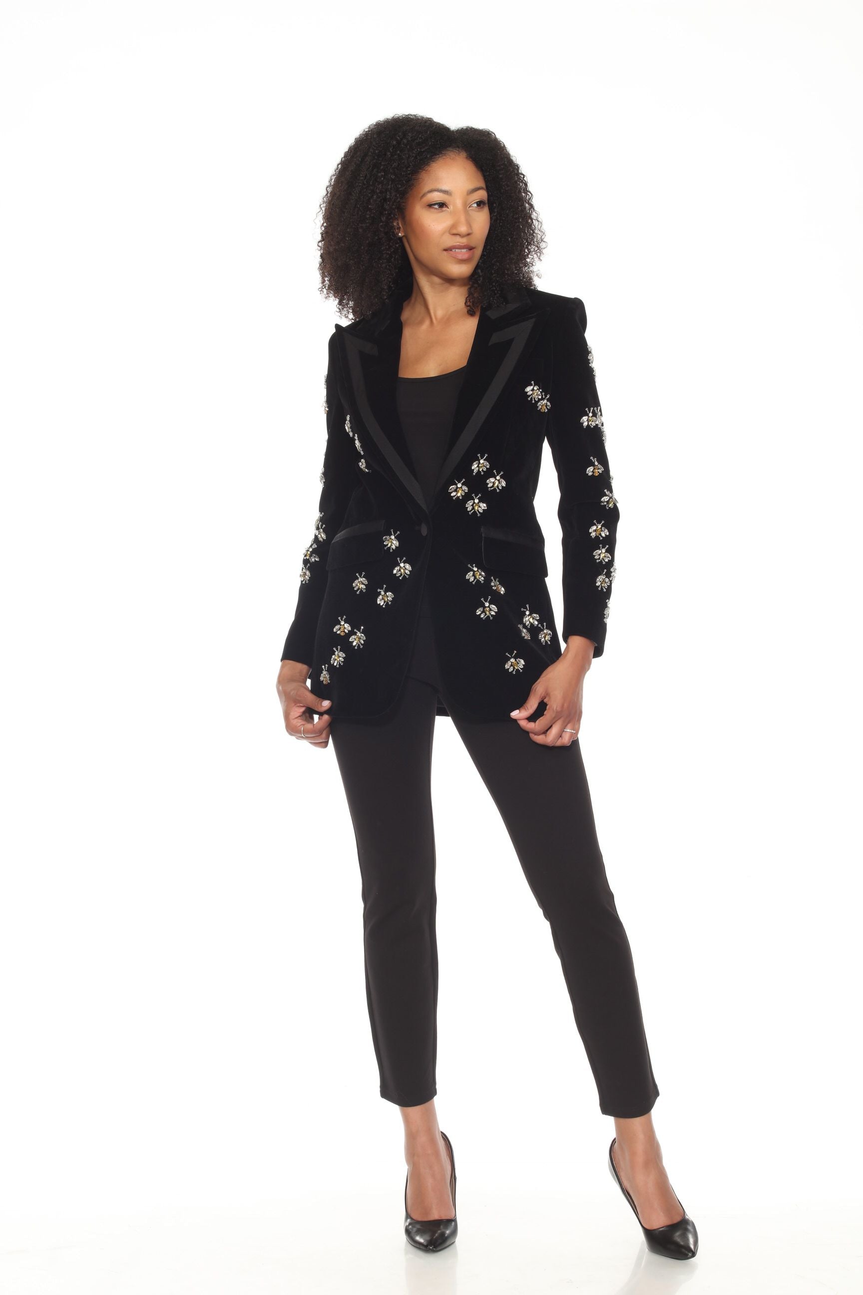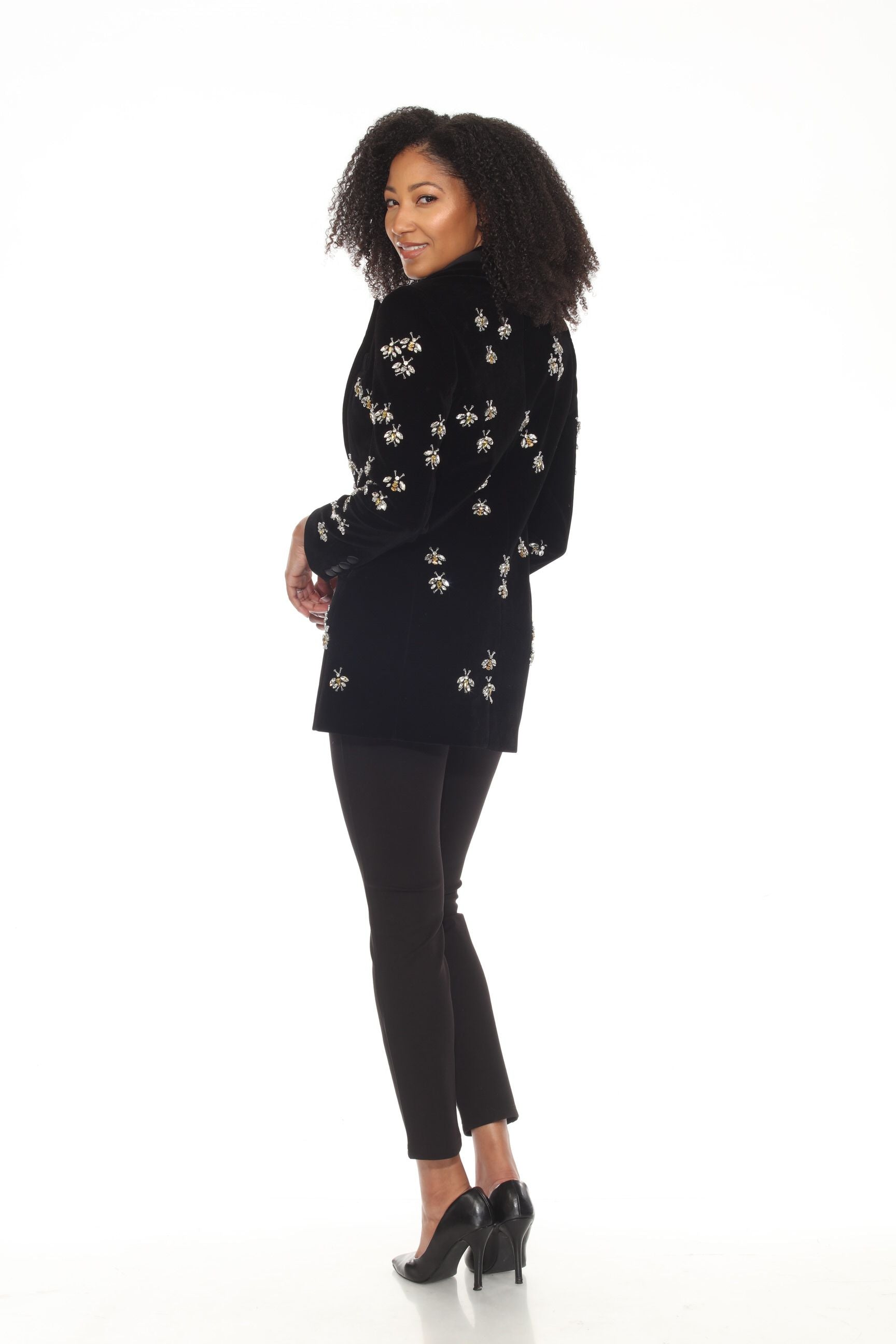 Elevate your wardrobe with this exquisite velvet jacket, where timeless elegance meets artistic detail. Luxurious velvet fabric drapes beautifully while intricate embroidered jeweled bees add a captivating focal point. Perfect for special occasions or refined everyday wear, this piece transforms any ensemble into a statement of refined taste and individuality.