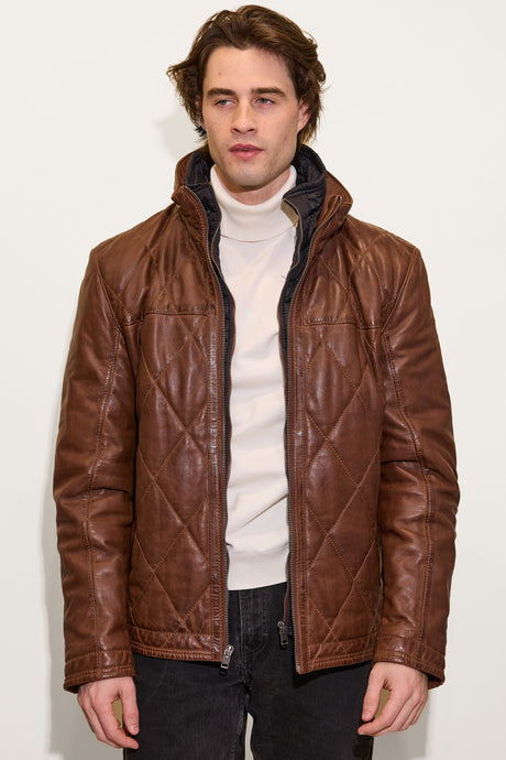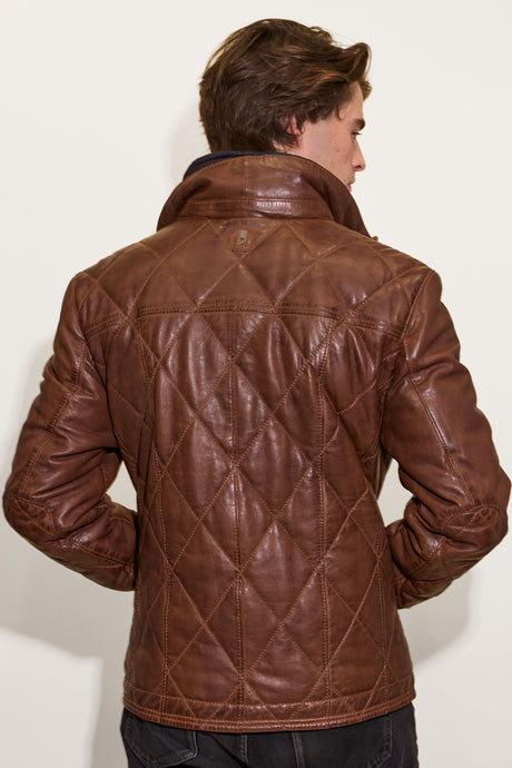 The Carlsen Jacket, crafted from genuine lambskin leather, features a quilted pattern with a removable neck insert for added insulation, keeping you warm as the temperatures drop. Balancing style and function, it’s a versatile piece built for everyday wear.