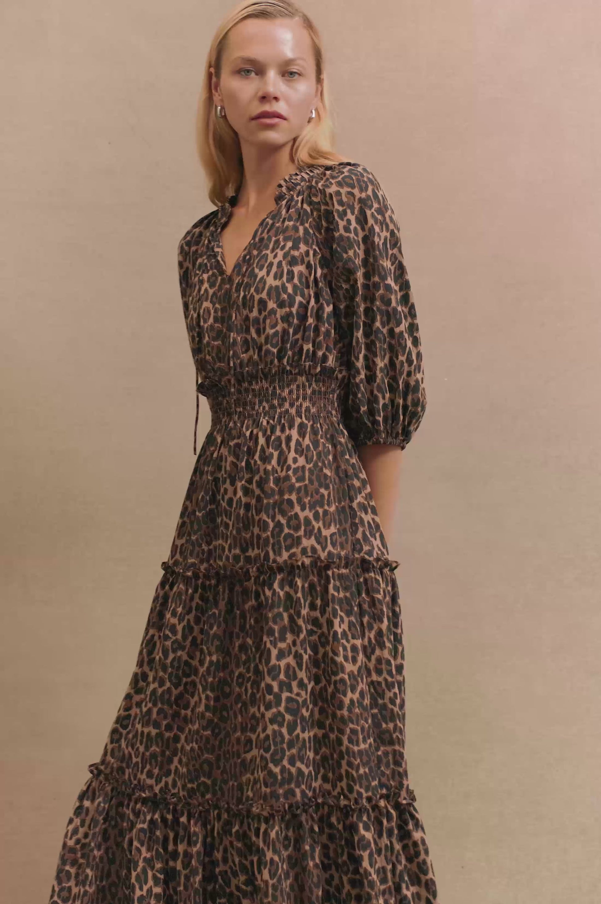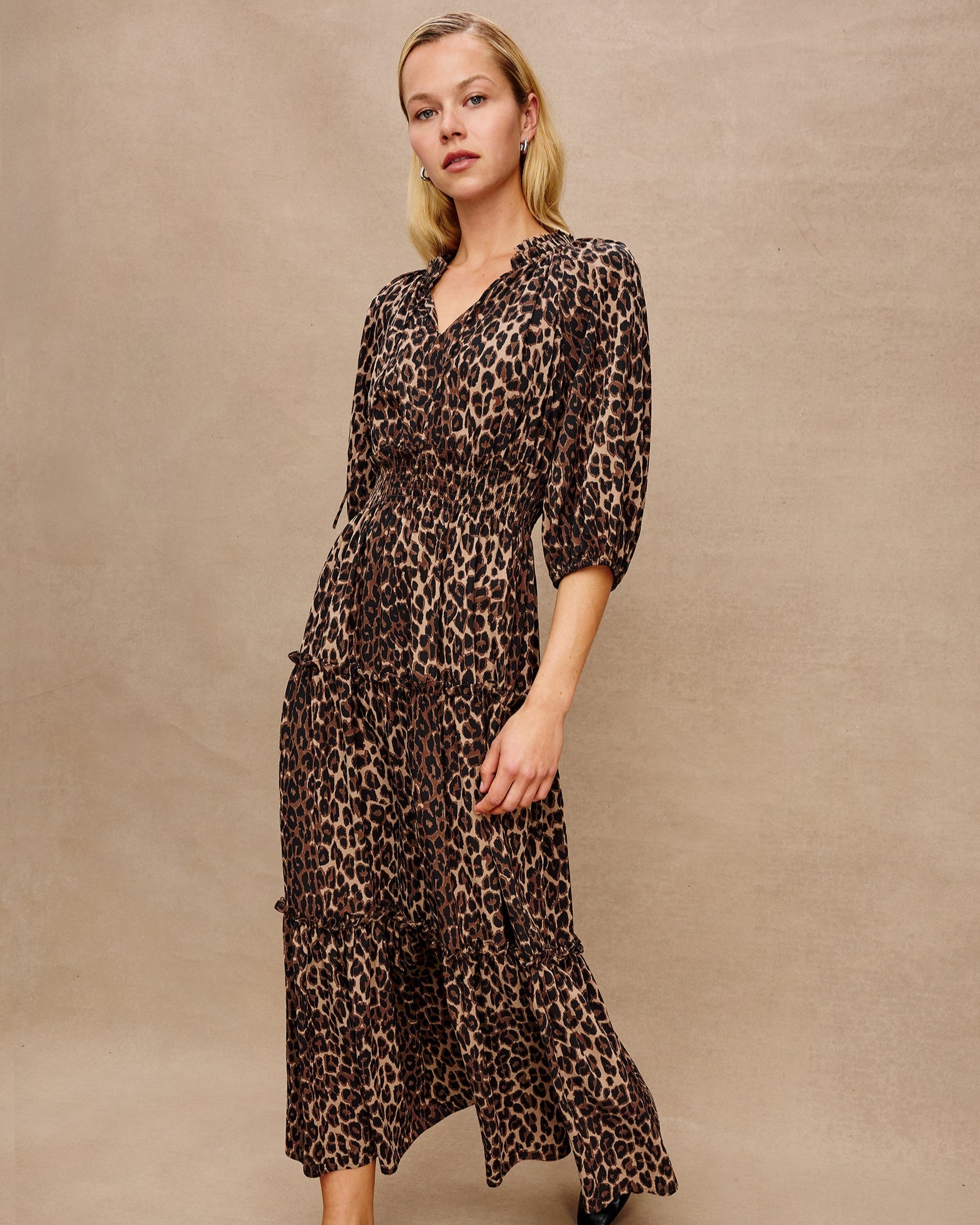 The Caterine is tiered maxi crafted from structured, breathable cotton poplin. With a cinched silhouette, neck ties and ruffled details, this dress is feminine and functional.