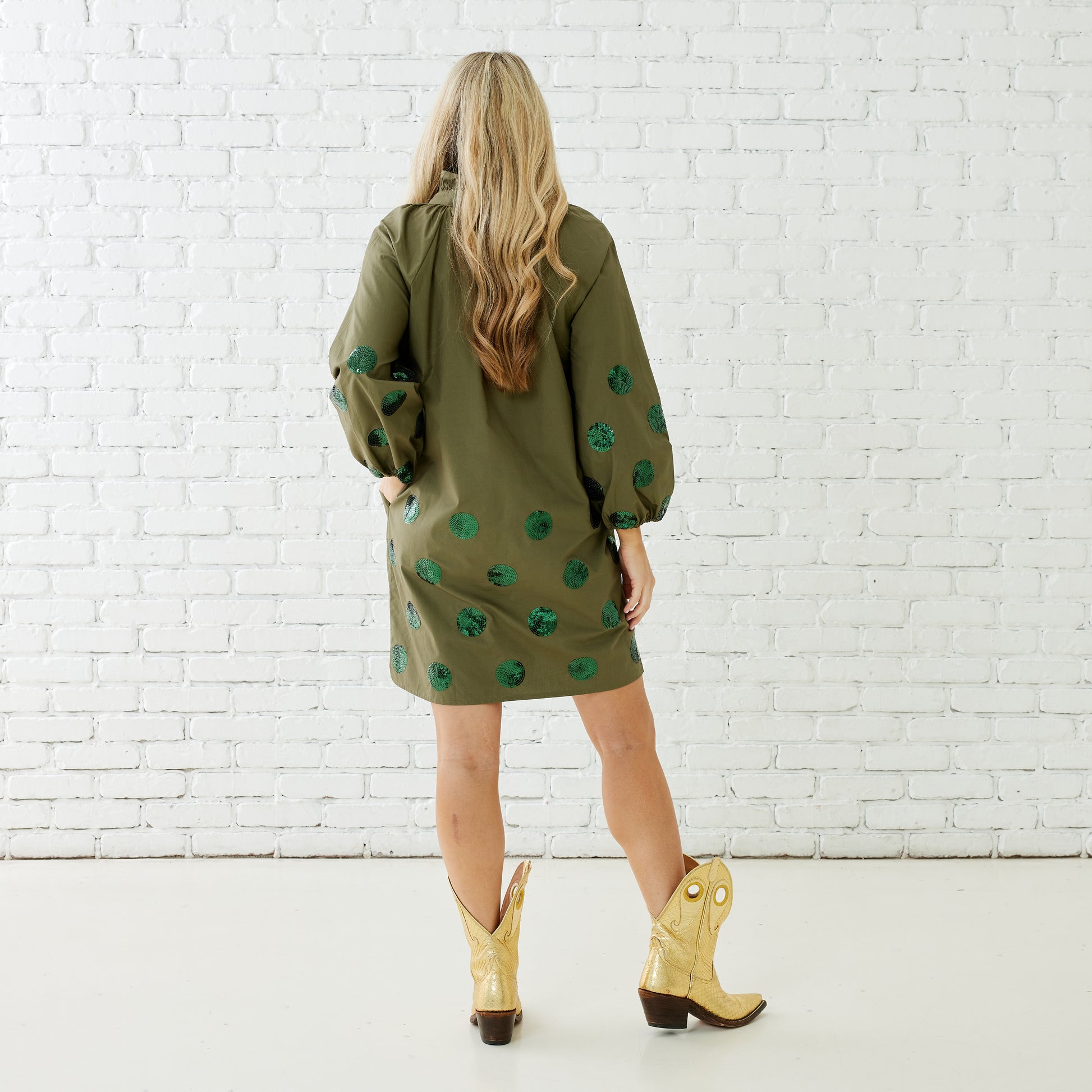 Effortless elegance with a touch of festive shine. The Celia Sparkle Dress is crafted in crisp cotton poplin and adorned with sequin circle detailing for a playful yet elevated look. Featuring a ruffled collar, covered buttons, and a relaxed silhouette, this dress offers all-day comfort while still making a statement. The elastic cuffs and hidden pockets complete the design with thoughtful, wearable ease.