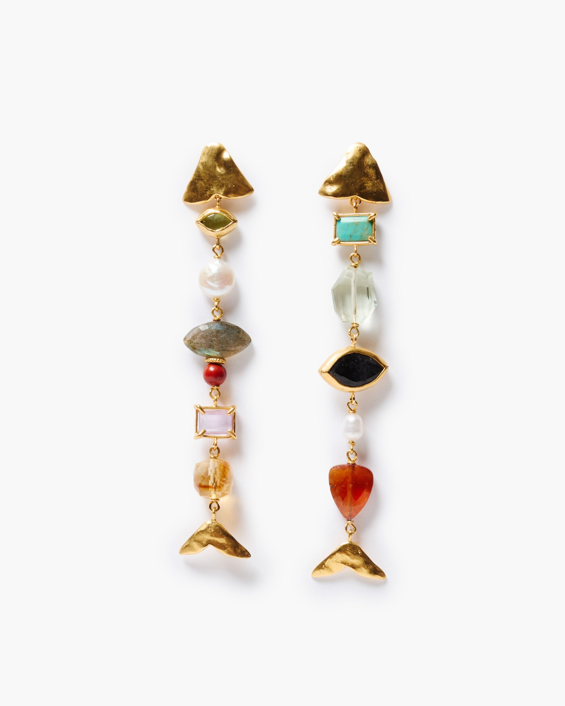 18K gold plated sterling silver mismatched fish earrings featuring peridot, labradorite, red jasper, pink and green amethyst, citrine, turquoise, hypersthene, hessonite, and freshwater pearls on post backs. 3 inch drop.