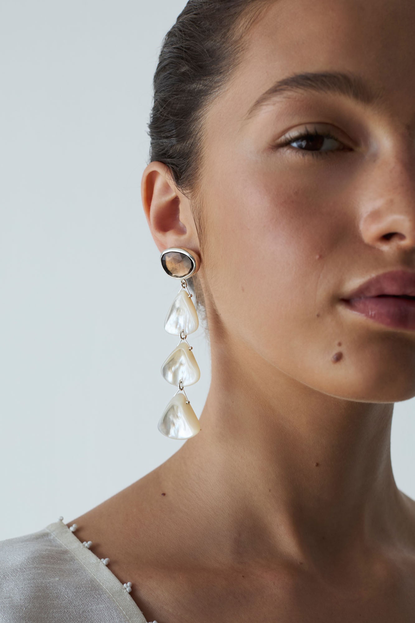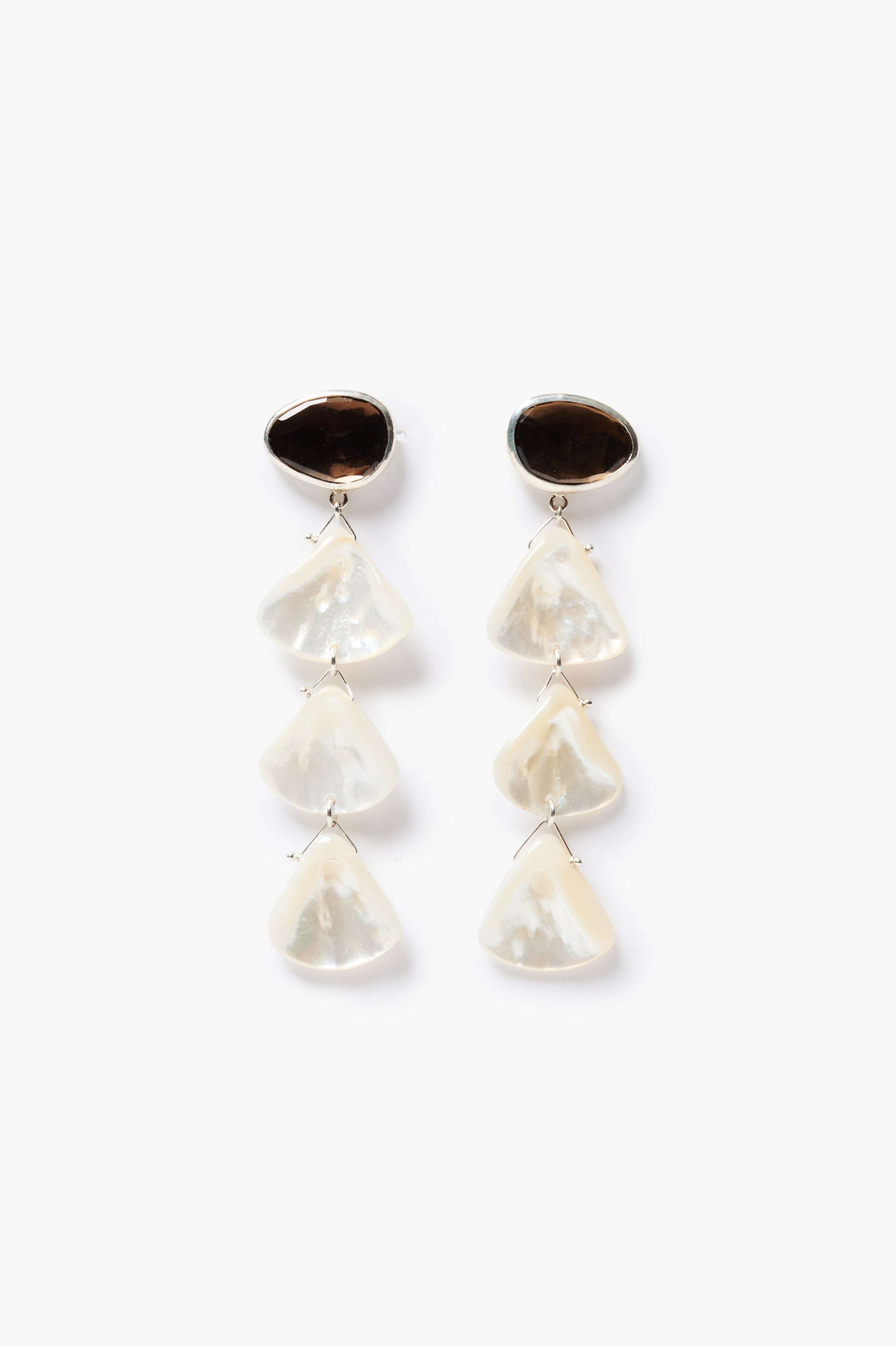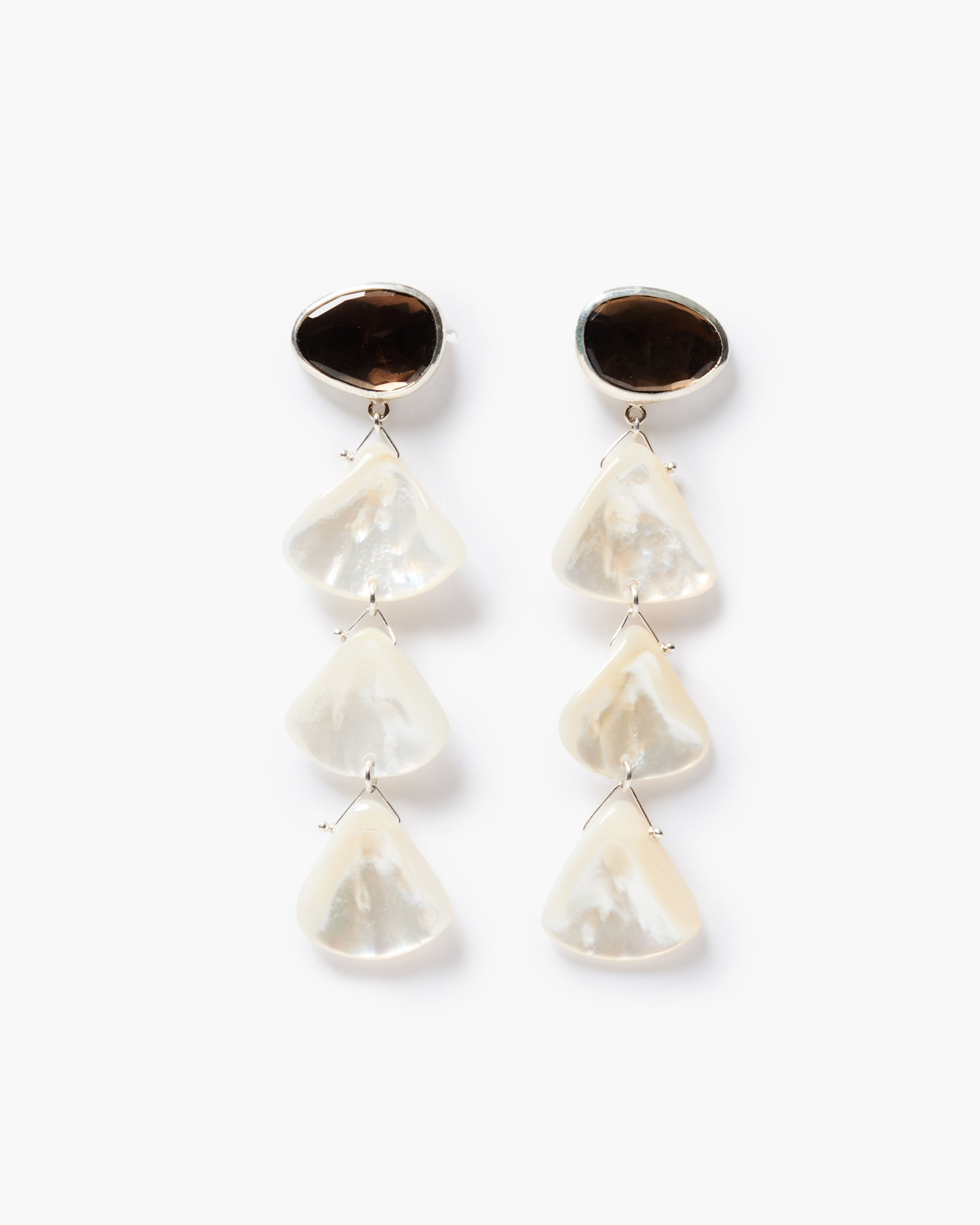 Sterling silver post back earrings featuring smokey quartz and cascading white mother of pearl . 3 1/4 inch drop.