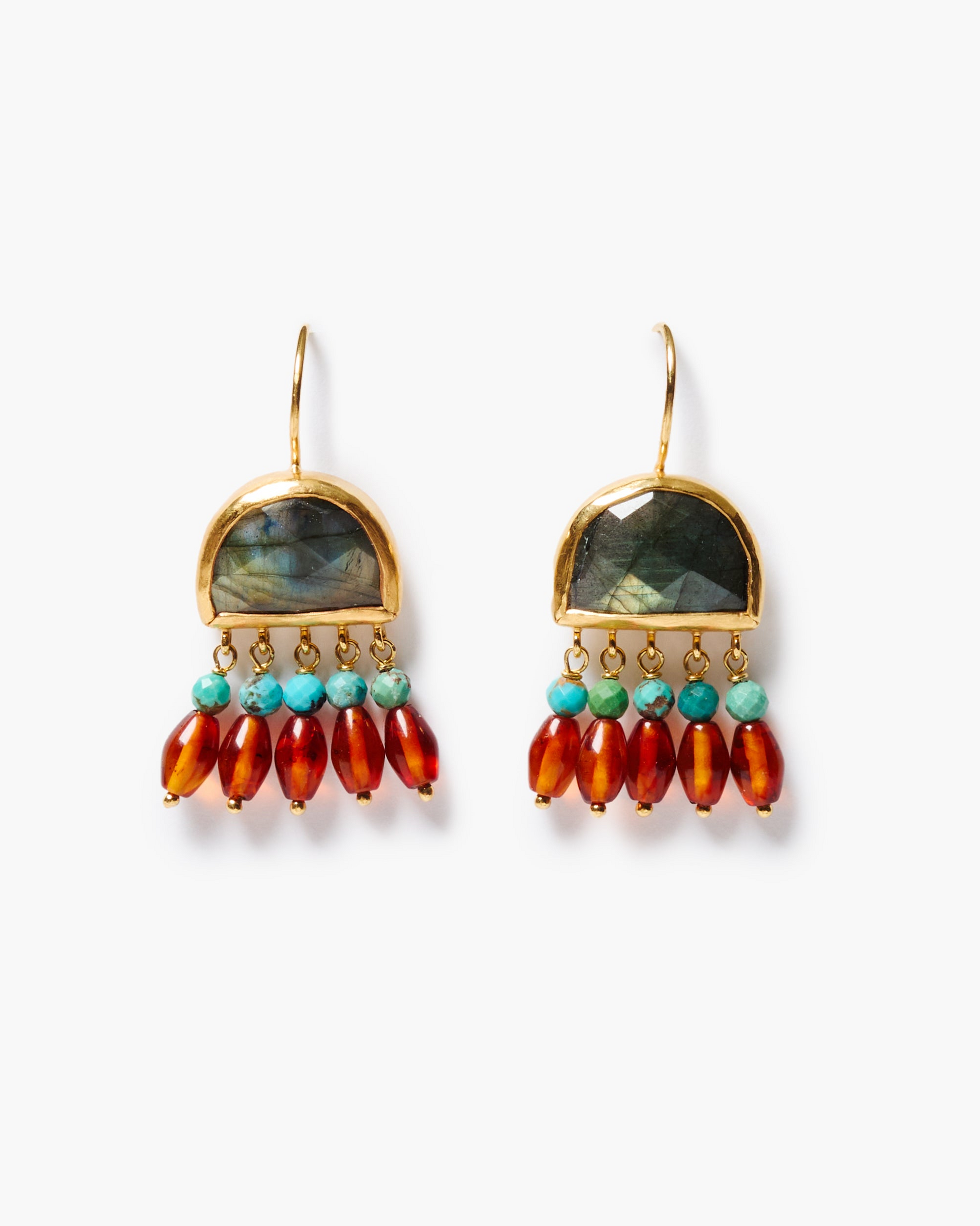 18K gold plated sterling silver necklace featuring bezel wrapped labradorite, amber, and turquoise on French hooks. 1 1/2 inch drop.