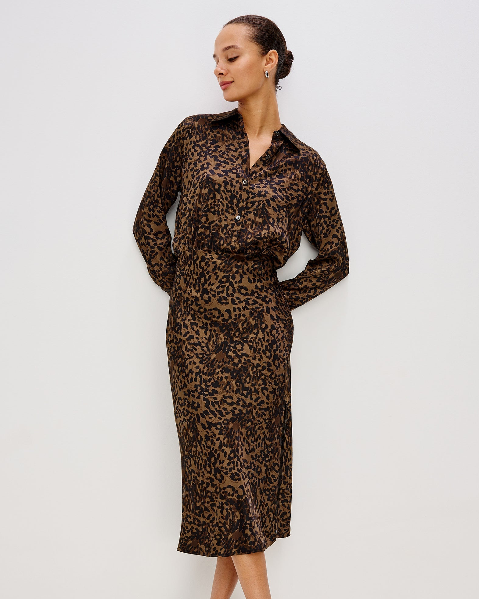 Designed for effortless movement, the Jazlyn features a lustrous leopard-print fabric, classic collar, long sleeves, and front half-placket, flowing into a bias-cut skirt for a refined, seamless silhouette.