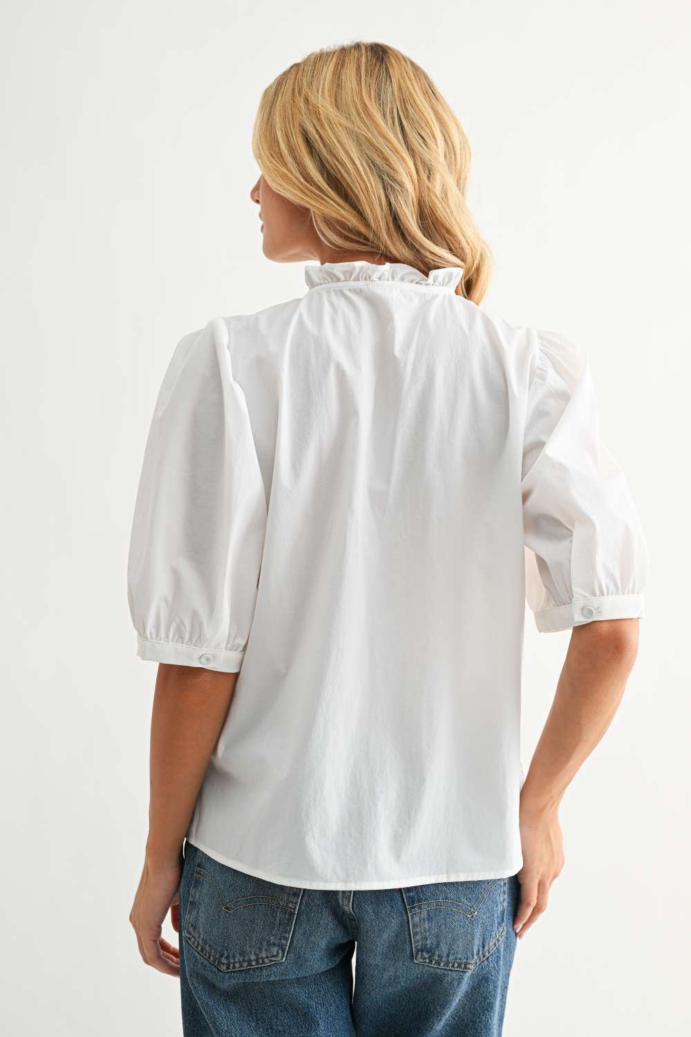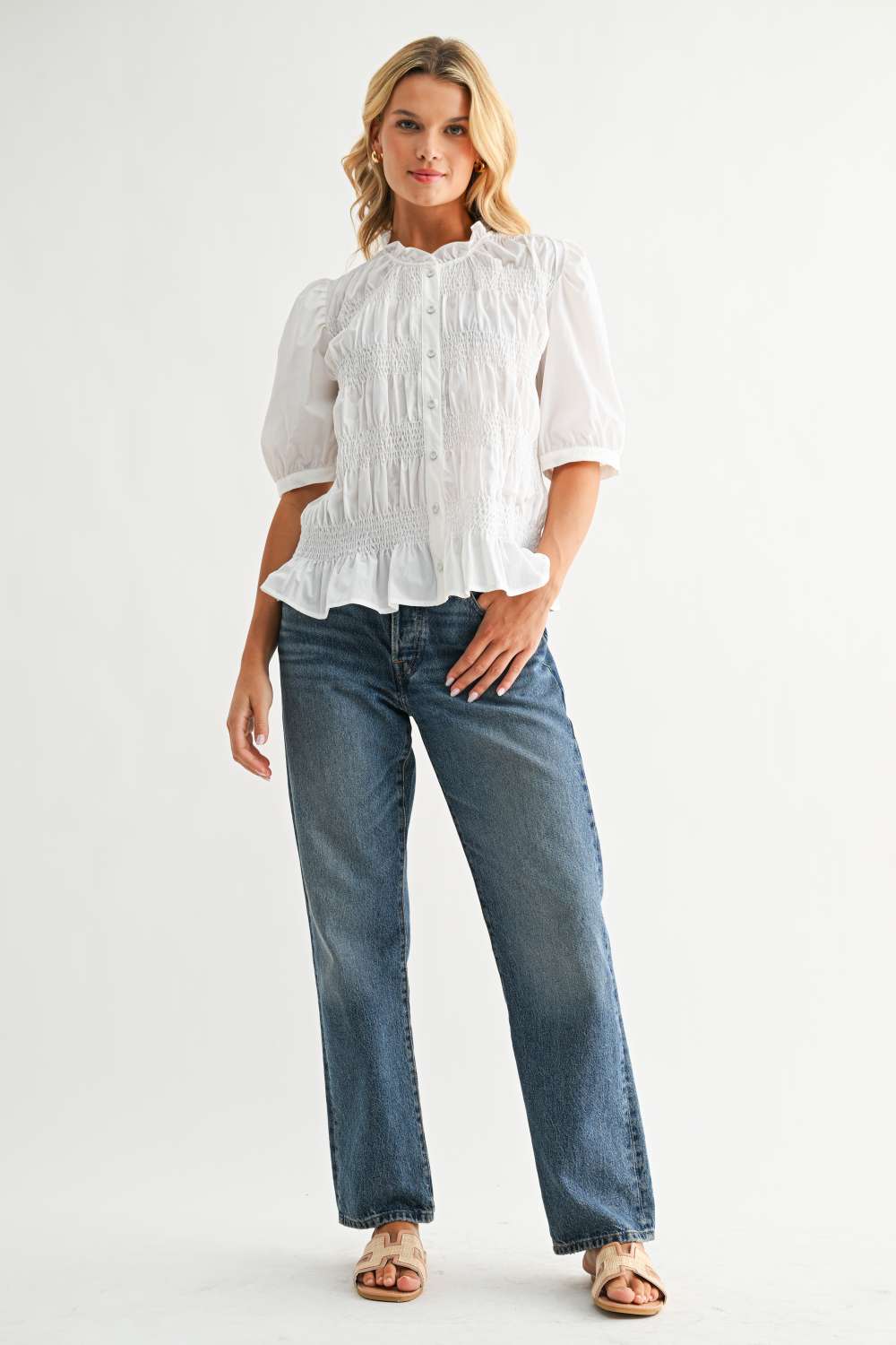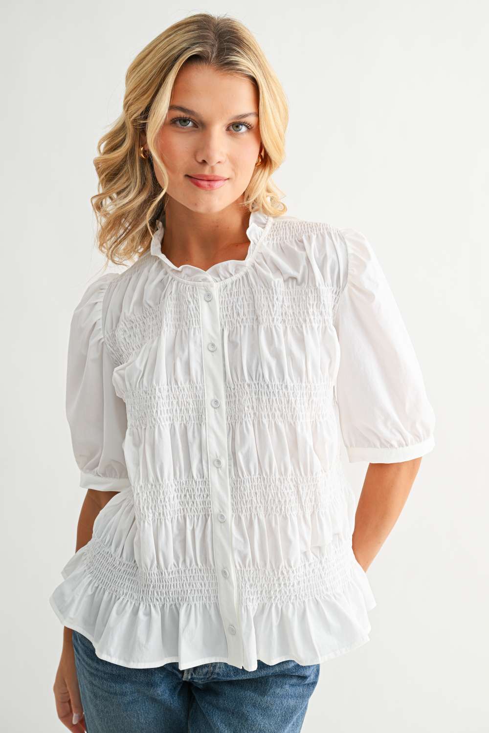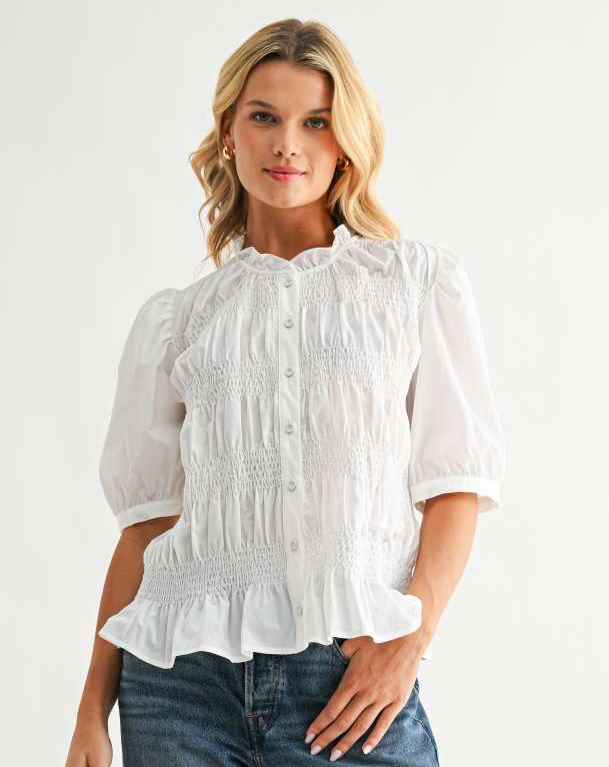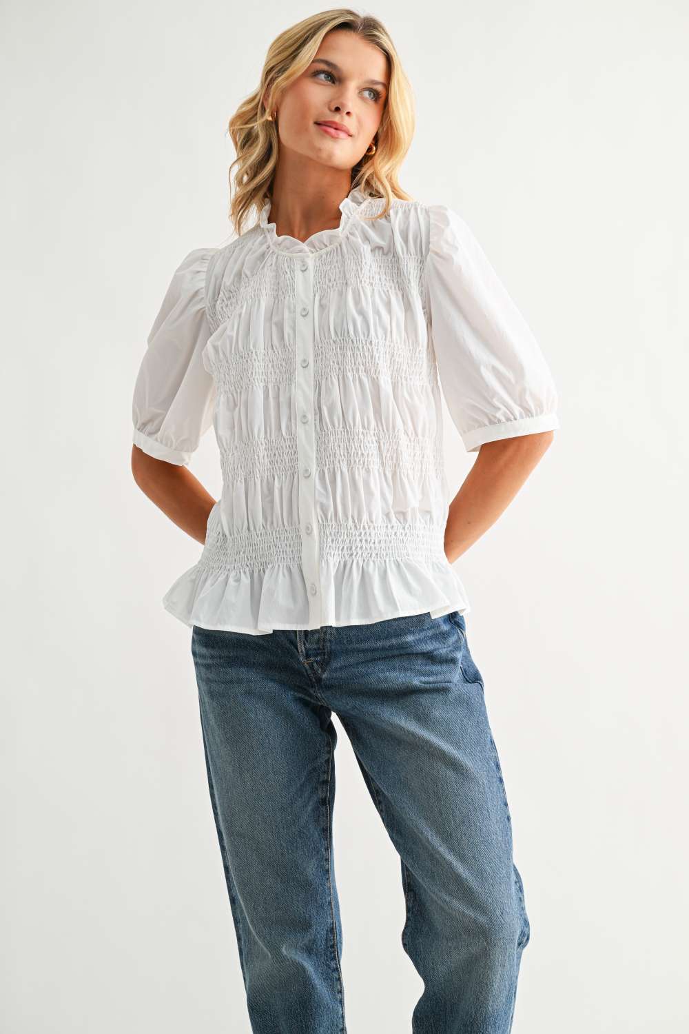 The Jessica Top is a feminine smocked top featuring a ruffle neckline, button-front closure, and short puff sleeves. Designed with stretchy smocking throughout the body and a softly flared peplum hem for a flattering, comfortable fit.