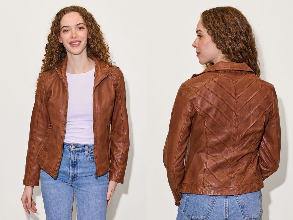The Jolah Leather Jacket features polished seams and contrast zippers for a perfectly worn-in, vintage feel. Vegetable tanned and ethically produced, designed with care for the socially conscious. Secured interior chest pockets. Contemporary silhouette with chevron back detail. Made of 100% lambskin leather.