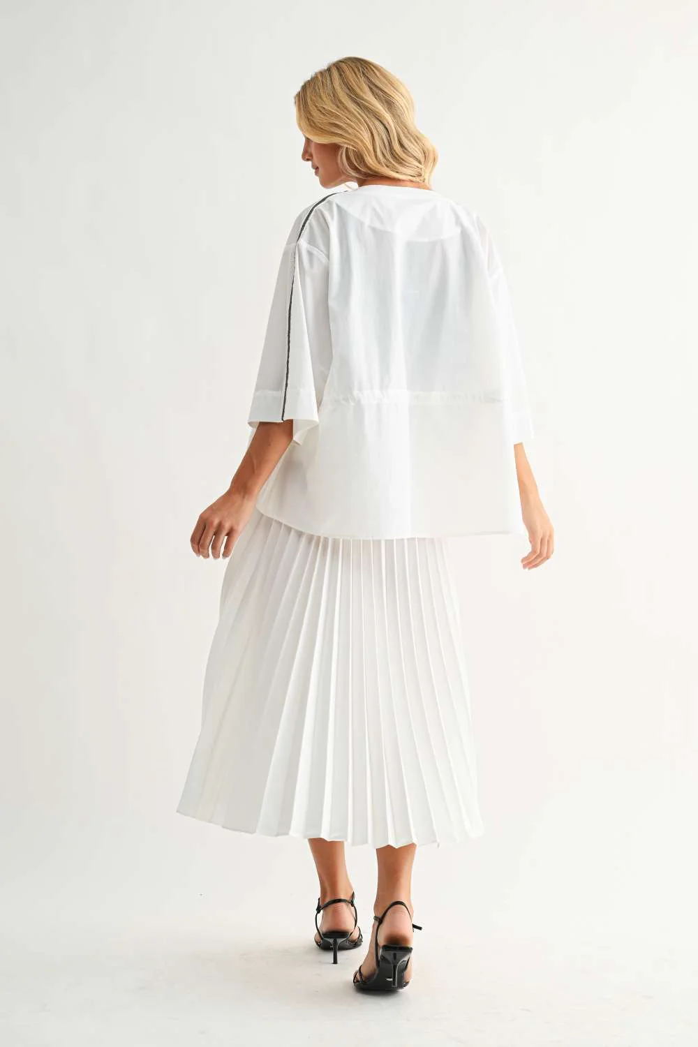 A lightweight, modern top/jacket designed with an airy, relaxed silhouette and made with a woven parachute material. Features a clean front zipper closure, soft drape, and wide three-quarter sleeves accented with a subtle contrast stripe for a sporty touch. Finished with a slightly curved hem and side pockets, making it easy to layer while keeping the look polished and effortless.