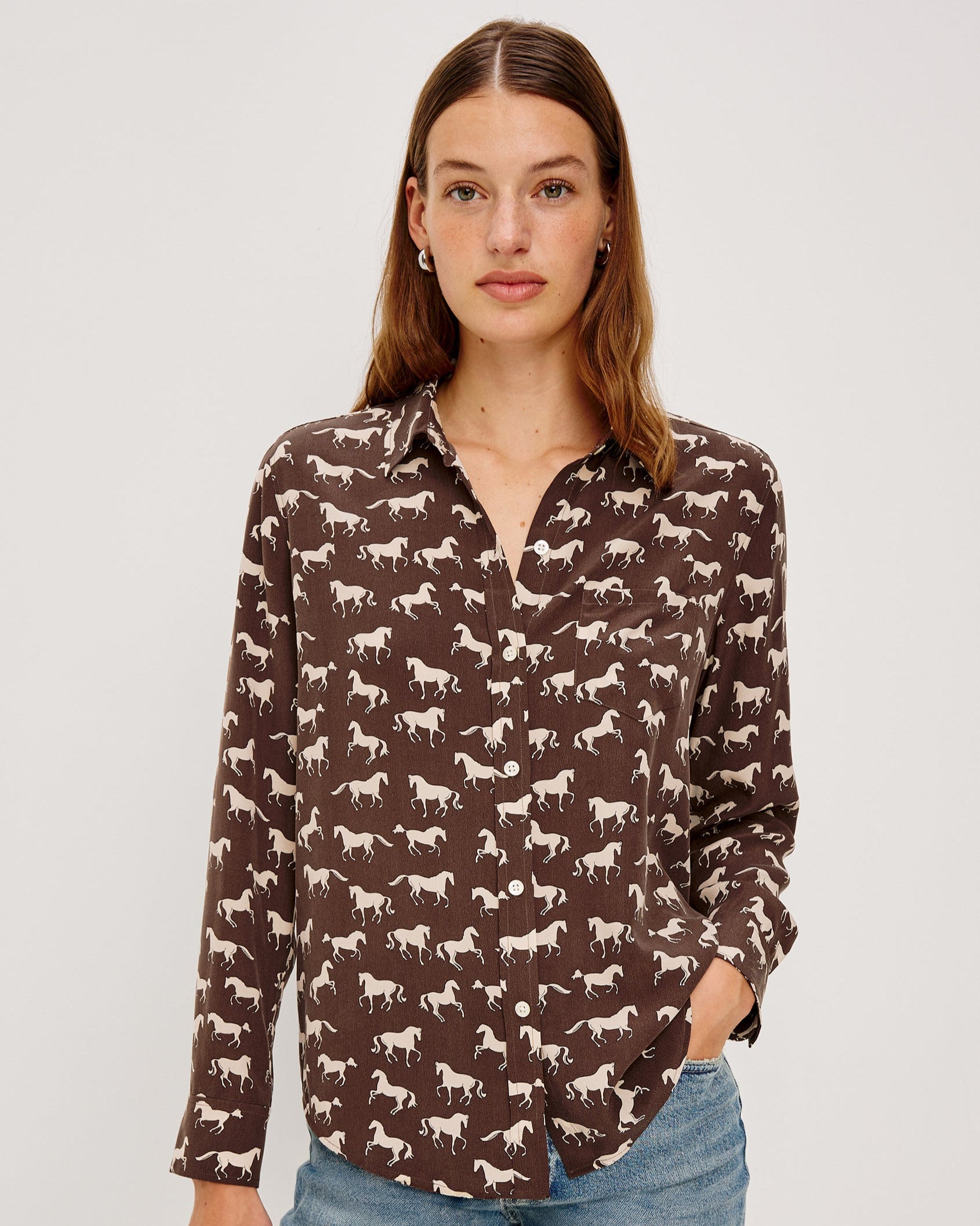 The Kate is an ultra-soft, washed silk button-down. It boasts classic shirting details with a unique print for a polished look.