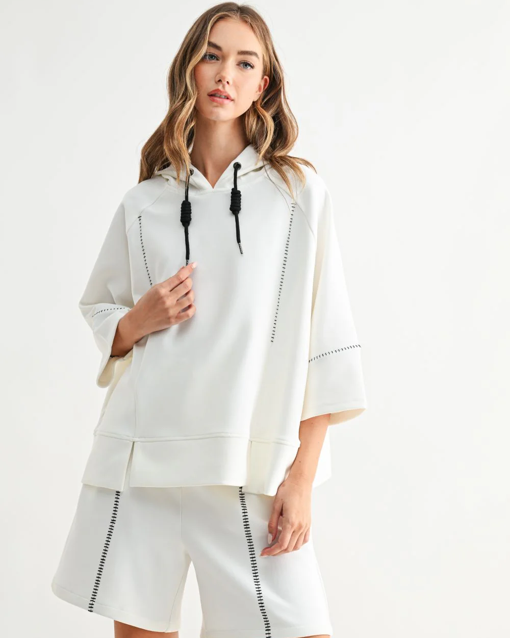 The Kendrick Top is a relaxed hooded top with a clean, sporty-chic vibe. Designed with a soft drape, contrast stitch detailing, small slits in the front, and wide sleeves for effortless comfort. Perfect for casual days, travel, lounging, or elevated athleisure looks.