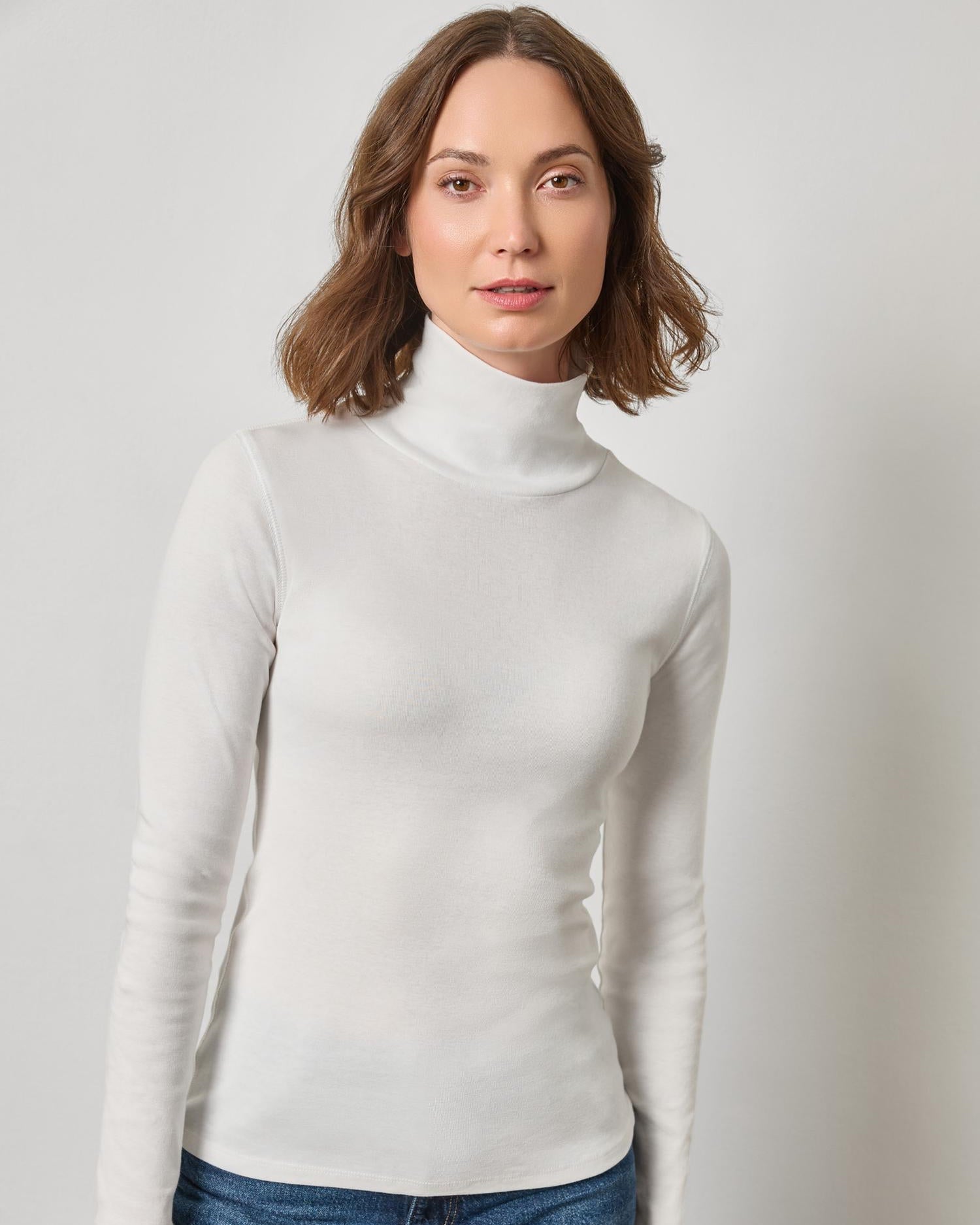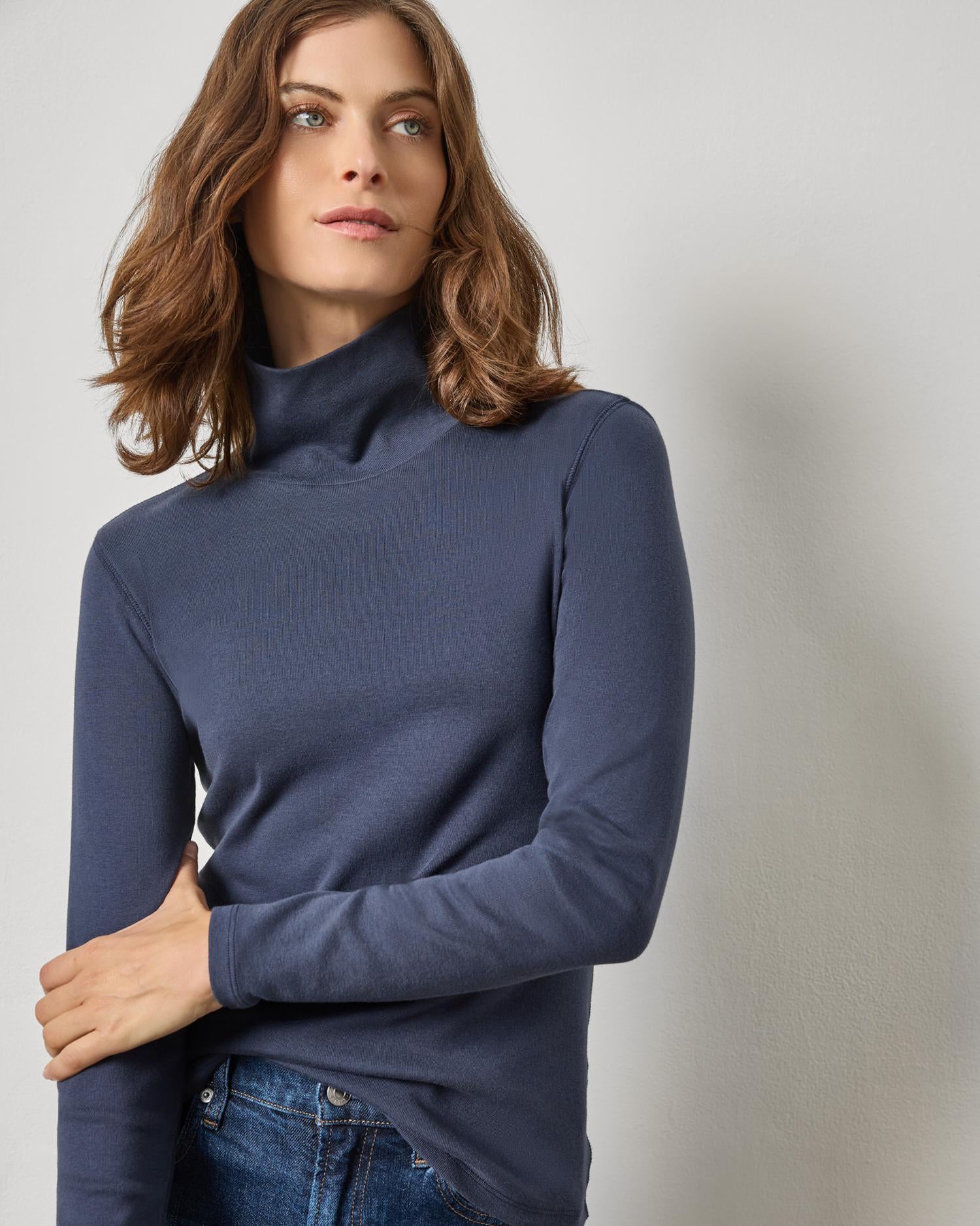 In Lilla P's heavier weight 1x1 rib cotton, this turtleneck fits closer to the body and can be worn alone or works well as a layering piece for fall.