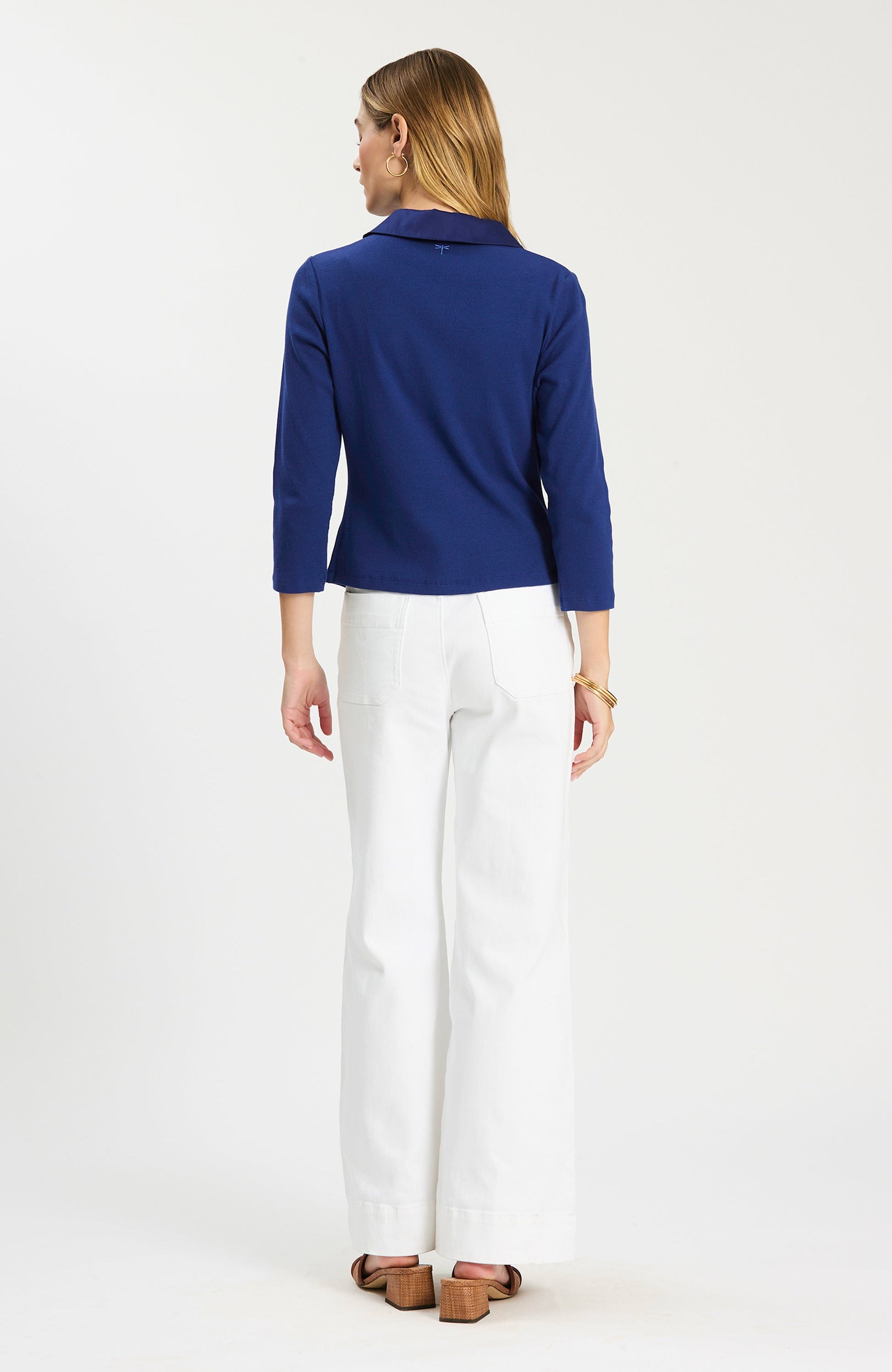 Meet your new go-to essential: the Poppy Ribbed Collar Tee. Cut from a soft, stretchy rib knit, it features a polished collared V-neck placket with tonal buttons and three-quarter sleeves. The slightly cropped, relaxed fit pairs effortlessly with high-rise denim, pants, or skirts—cute enough for plans, comfy enough for everyday.