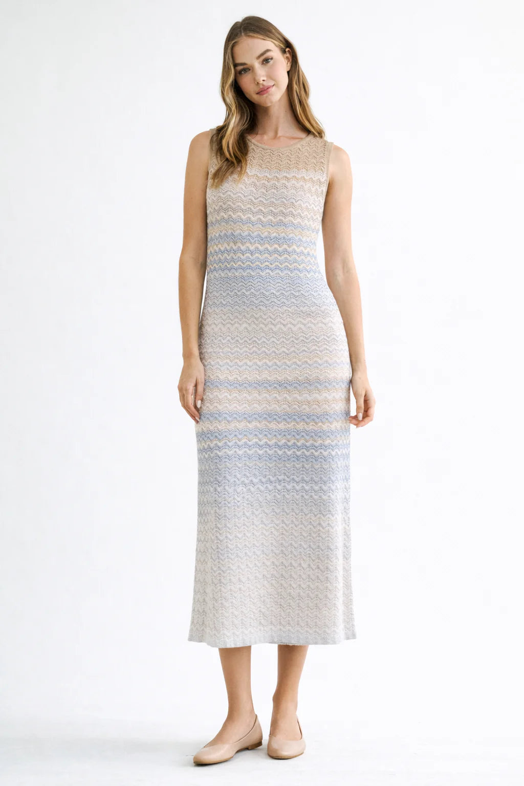 The Scott Dress is a sleeveless knit midi dress featuring a soft chevron ombre pattern and a relaxed, straight silhouette. Designed with a classic round neckline and lightweight feel for effortless, all-day wear.