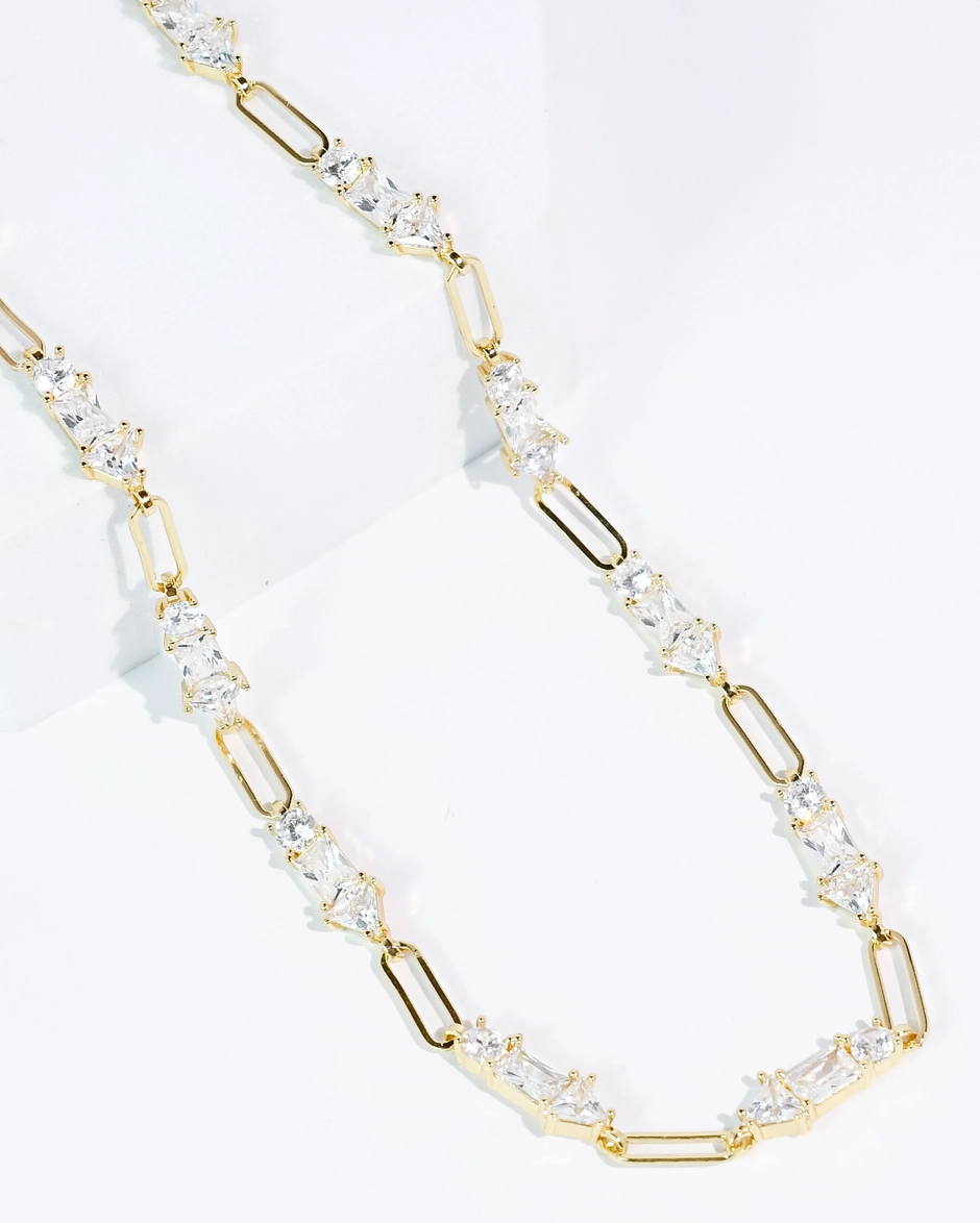 * Meet the necklace that does everything, elegance, sparkle, and a touch of modern glam. * Features a dreamy mix of baguette cut crystals paired with sleek elongated gold links, creating a perfect balance of sophistication and edge. * Lightweight, timeless, easy to wear, and absolutely stunning. * 13 inches + 3 inches extender.