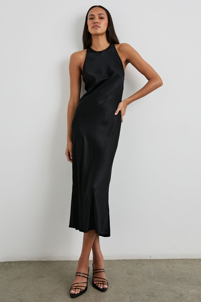 Embody effortless elegance in Solene. Cut from lightweight satin crepe, this midi-dress has a lustrous sheen that makes it a perfect fit for any formality. Tie the adjustable keyhole closure at the back to ensure a comfortable fit.