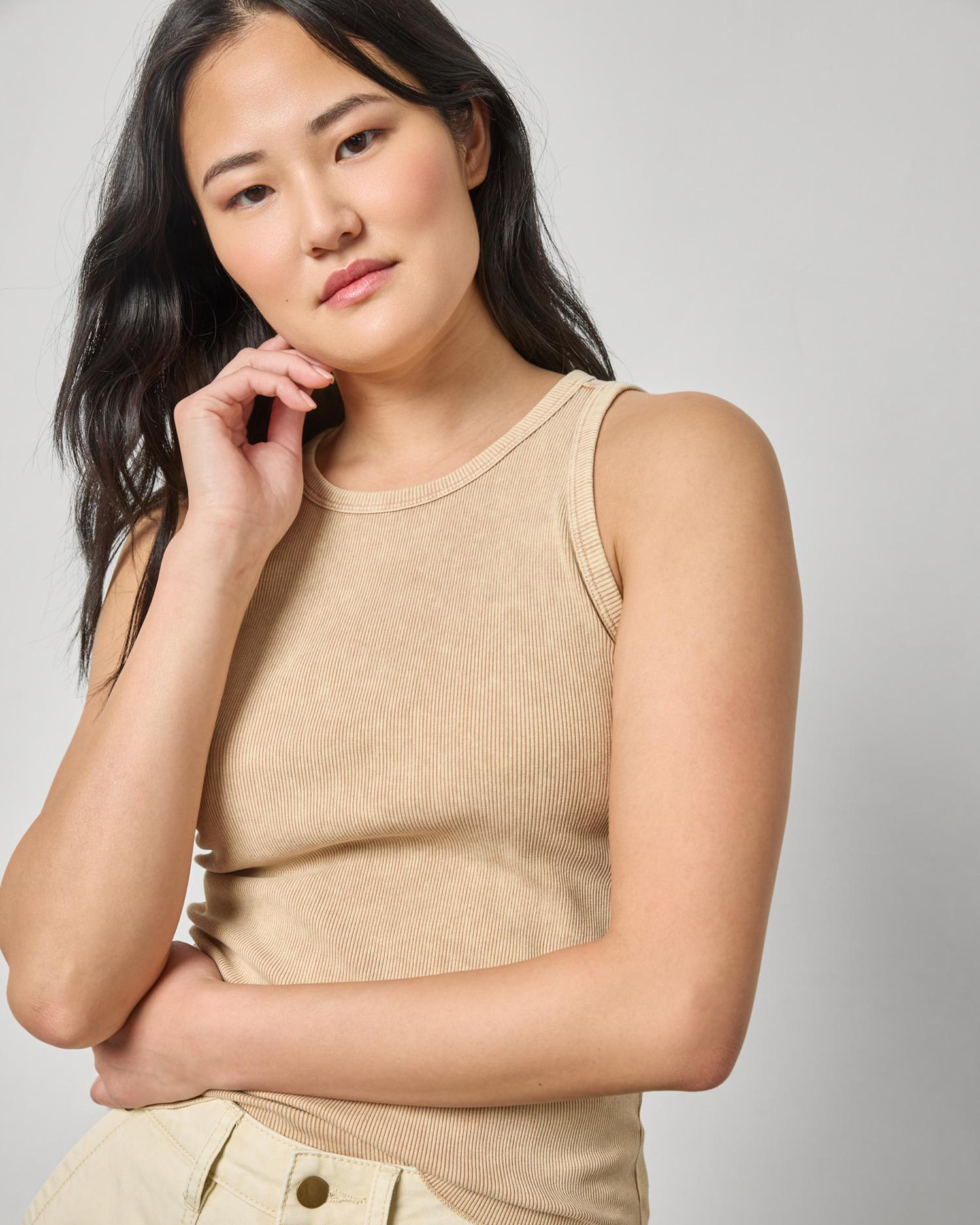 The Sunwashed Rib Tank is simple, chic, and versatile. This cotton ribbed fabric has a touch of spandex, offering a close-to-the-body fit that holds its shape while feeling incredibly soft against the skin. Heavier in weight for a flattering, sleek look, this tank is elevated by a special wash process that creates a garment-dyed, sun-faded finish, giving it the perfect lived-in feel from the very first wear.