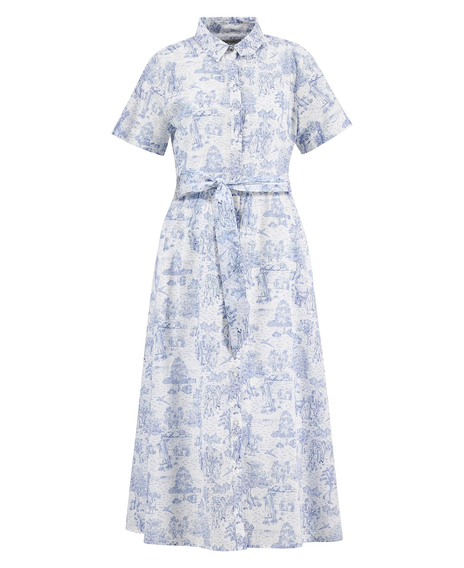 The Barbour Wisteria Midi Dress is a relaxed-fit style crafted from 100% lightweight cotton in a delicate toile de jour print. Featuring a branded brass shank button at the top neck, branded imitation mother-of-pearl buttons along the front placket and cuffs, and an ID bar at the back neck, it offers timeless Barbour detailing in a feminine silhouette
