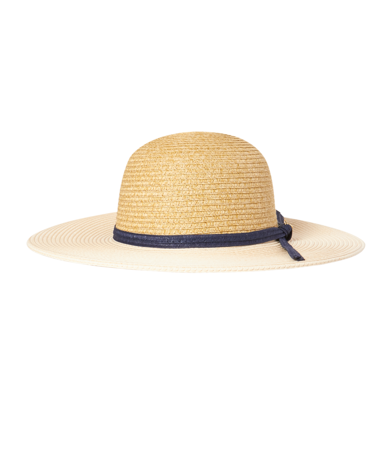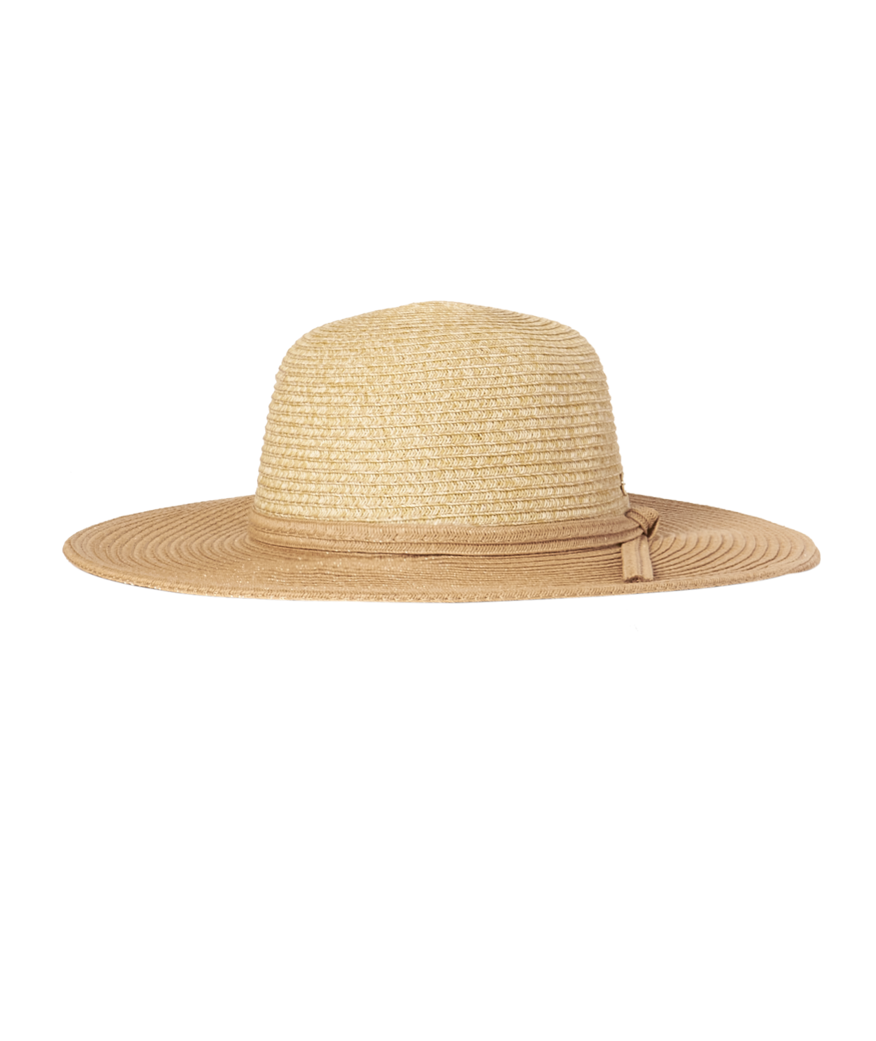 Graceful and classic wide brim hat with soft swooping curve and complimenting crown band.